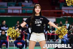 [점프볼=부산/박상혁 기자] 30일 부산사직체육관에서 2018-2019 SKT 5GX 프로농구 부산 KT와 창원 LG의 6강 플레이오프 4차전 경기가 열렸다. KT 치어리더가 치킨 이벤트를 하고 있다.