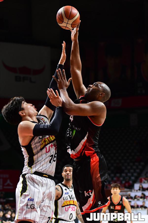 [점프볼=부산/박상혁 기자] 30일 부산사직체육관에서 2018-2019 SKT 5GX 프로농구 부산 KT와 창원 LG의 6강 플레이오프 4차전 경기가 열렸다. KT 랜드리가 LG 김종규를 앞에 두고 슛을 올리고 있다.