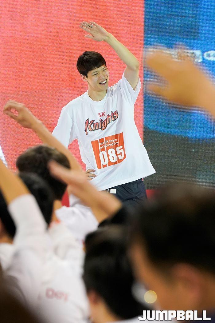 [점프볼=잠실/유용우 기자] SK 나이츠 농구단은 30일 잠실 학생체육관에서 18-19 시즌동안 SK를 응원해준 팬들을 위한 '2019 SK 나이츠 팬스 기빙데이' 팬행사를 마련했다. SK 김선형이 팬들 앞에 서서 체조시범을 보이고 있다.