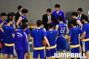 [점프볼=신촌/박상혁 기자] 1일 연세대 신촌캠퍼스 체육관에서 2019 대학농구 U-리그 연세대와 경희대의 경기가 열렸다. 연세대 박지원이 김한영에게 의견을 전달하고 있다.