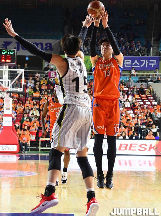[점프볼=인천/문복주 기자] 4일 인천 삼산월드체육관에서 열린 '2018-2019 SKT 5GX 프로농구' 인천 전자랜드와 창원 LG의 4강 플레이오프 1차전 경기, 전자랜드 강상재가 수비를 앞에두고 중거리슛을 시도하고 있다.