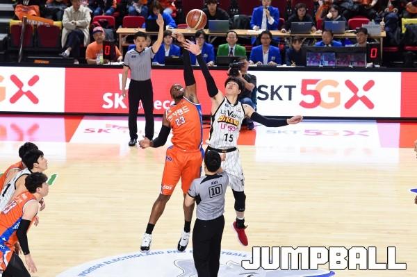[점프볼=인천/윤희곤 기자] 6일 인천 삼산월드체육관에서 열린 ‘2018-2019 SKT 5GX 프로농구’ 인천 전자랜드와 창원 LG와의 4강 플레이오프 2차전. 전자랜드 찰스로드와 LG 김종규의 점프볼로 경기가 시작했다.