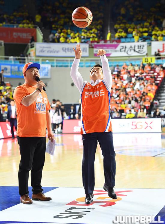 [점프볼=인천/문복주 기자] 6일 인천 삼산월드체육관에서 열린 '2018-2019 SKT 5GX 프로농구' 인천 전자랜드와 창원 LG의 4강 플레이오프 2차전, 전자랜드 홈 시투로 오동주 나은병원 명예원장이 자유투를 던지고 있다.
