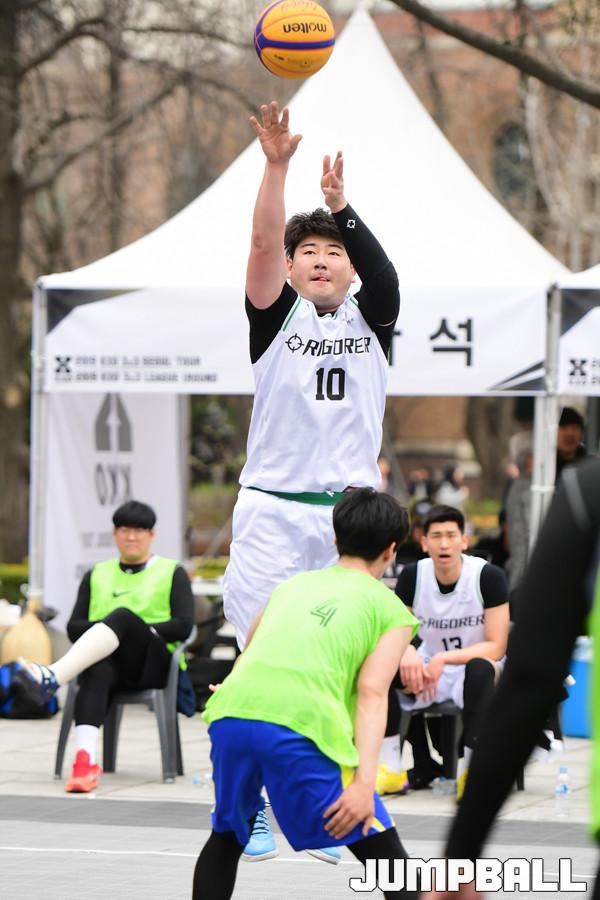 [점프볼=서울/박상혁 기자] 6일 서울 대학로 마로니에 공원에서 2019 KXO리그 1라운드 겸 KXO 3x3 서울투어가 열렸다. 부산의 리고러코리아 강민우가 슛을 시도하고 있다.