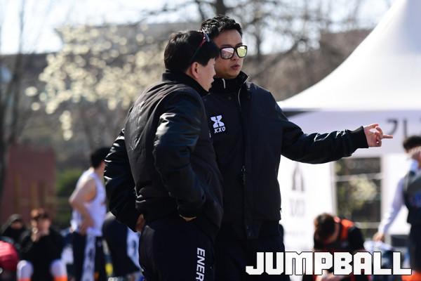 [점프볼=서울/박상혁 기자] 7일 서울 대학로 마로니에 공원에서 2019 KXO리그 1라운드 겸 KXO 3x3 서울투어 2일차 경기가 열렸다. 작전 시간에 심판들이 경기 조율에 관한 얘기를 나누고 있다.