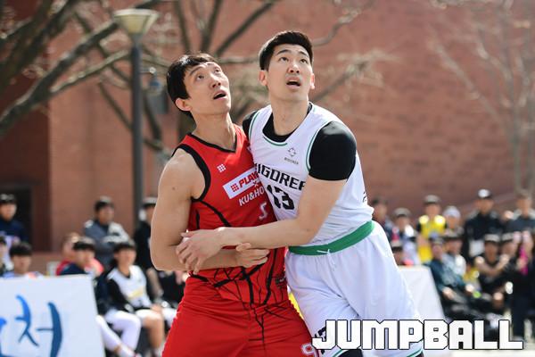[점프볼=서울/박상혁 기자] 7일 서울 대학로 마로니에 공원에서 2019 KXO리그 1라운드 겸 KXO 3x3 서울투어 2일차 경기가 열렸다. 한울건설 김상훈과 리고러 코리아 엄정현이 리바운드 자리다툼을 벌이고 있다.