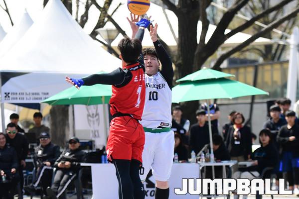 [점프볼=서울/박상혁 기자] 7일 서울 대학로 마로니에 공원에서 2019 KXO리그 1라운드 겸 KXO 3x3 서울투어 2일차 경기가 열렸다. 리고러 코리아 강민우가 수비수를 달고 2점슛을 시도하고 있다.