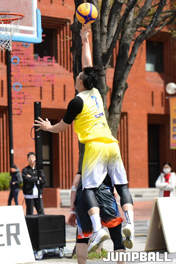 [점프볼=서울/박상혁 기자] 7일 서울 대학로 마로니에 공원에서 2019 KXO리그 1라운드 겸 KXO 3x3 서울투어 2일차 경기가 열렸다. PHE 강우형이 수비수를 앞에두고 레이업슛을 올리고 있다.