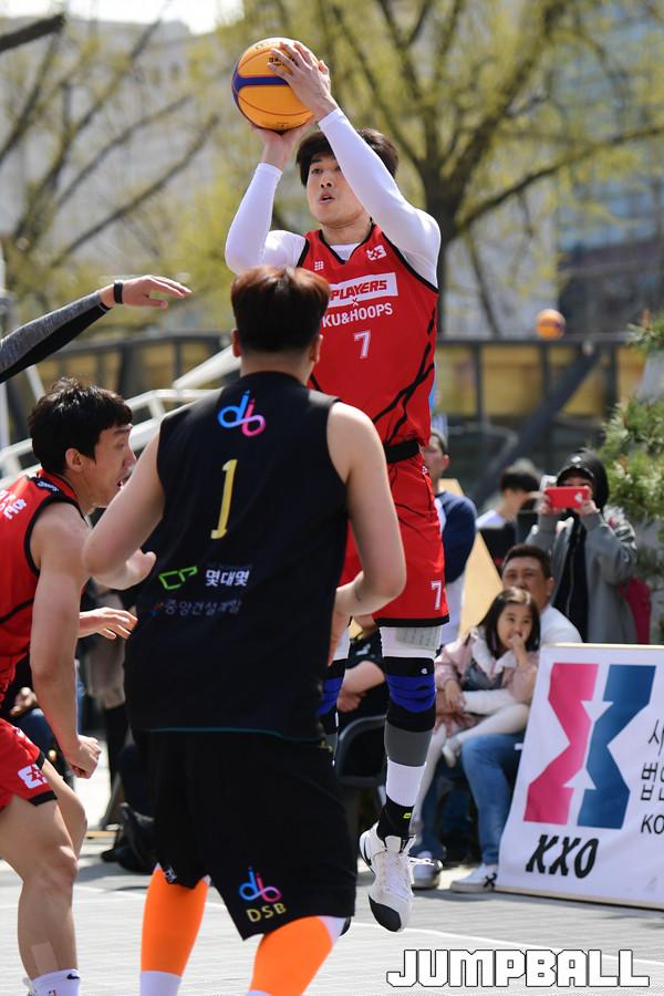 [점프볼=서울/박상혁 기자] 7일 서울 대학로 마로니에 공원에서 2019 KXO리그 1라운드 겸 KXO 3x3 서울투어 2일차 경기가 열렸다. 리그 4강전에서 한울건설 방성윤이 3점슛을 시도하고 있다.