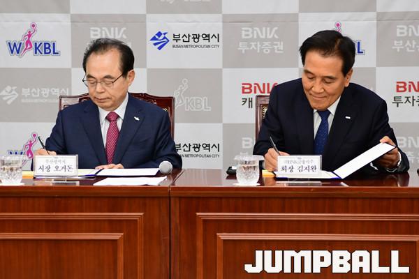 [점프볼=부산/박상혁 기자] 8일 부산시청 26층 회의실에서 BNK 썸 여자프로농구단 창단 기자회견이 열렸다. 오거돈 부산시장과 김지완 BNK금융그룹 회장이 협약서에 사인을 하고 있다.
