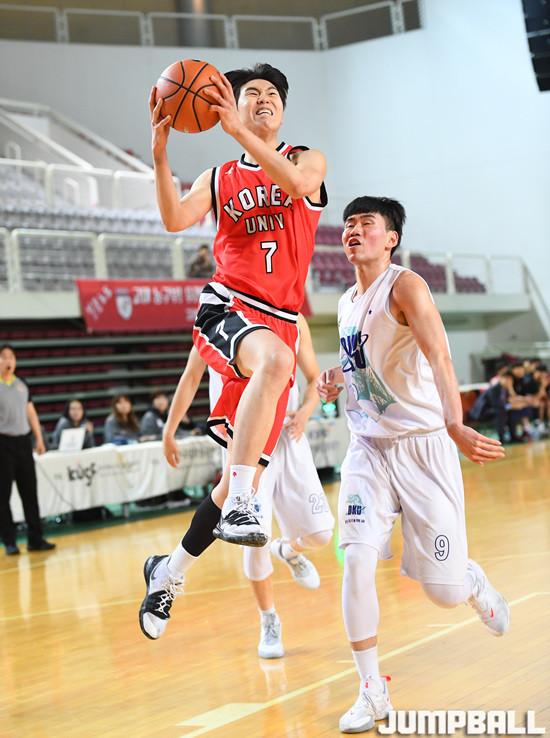 [점프볼=안암/문복주 기자] 9일 고려대학교 화정체육관에서 열린 '2019 KUSF 대학농구 U-리그' 고려대와 단국대의 경기. 고려대 이우석이 상대수비를 뿌리치고 레이업을 시도하고 있다.