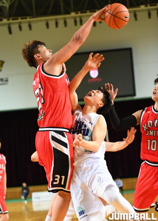 [점프볼=안암/문복주 기자] 9일 고려대학교 화정체육관에서 열린 '2019 KUSF 대학농구 U-리그' 고려대와 단국대의 경기. 단국대 윤성준의 골밑슛을 고려대 박정현이 블로킹을 하고 있다.