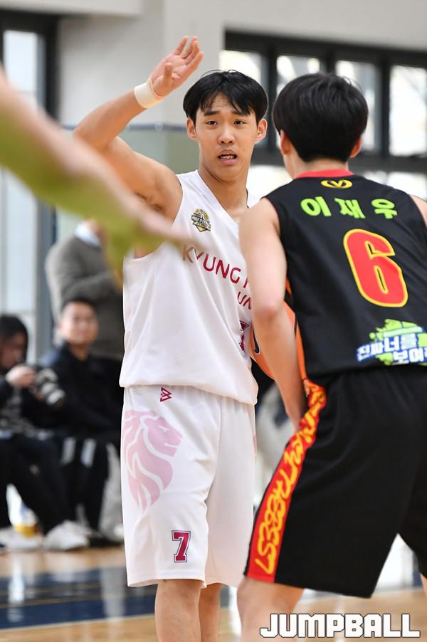[점프볼=수원/홍기웅 기자] 11일 성균관대학교 연습체육관에서 열린 '2019 KUSF 대학농구 U-리그' 성균관대와 경희대의 경기. 경희대 권혁준이 코트위 동료들에게 위치를 지시하고 있다.