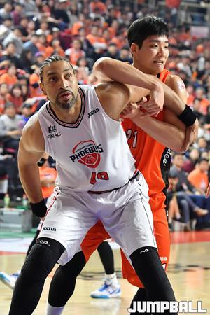 [점프볼=인천/홍기웅 기자] 17일 인천삼산체육관에서 열린 '2018-2019 SKT 5GX 프로농구' 챔피언결정전 3차전 인천 전자랜드와 울산 현대모비스의 경기. 전자랜드 정효근이 머리 뒤로 노룩 패스를 건네고 있다.
