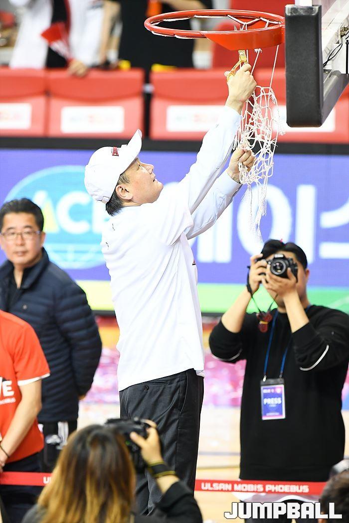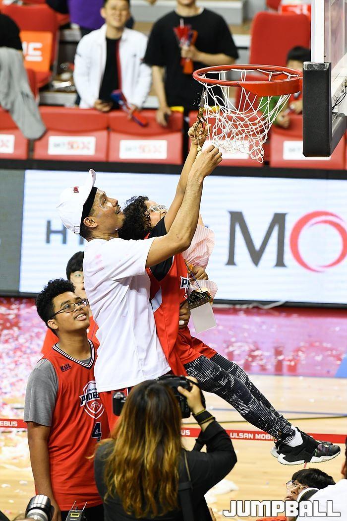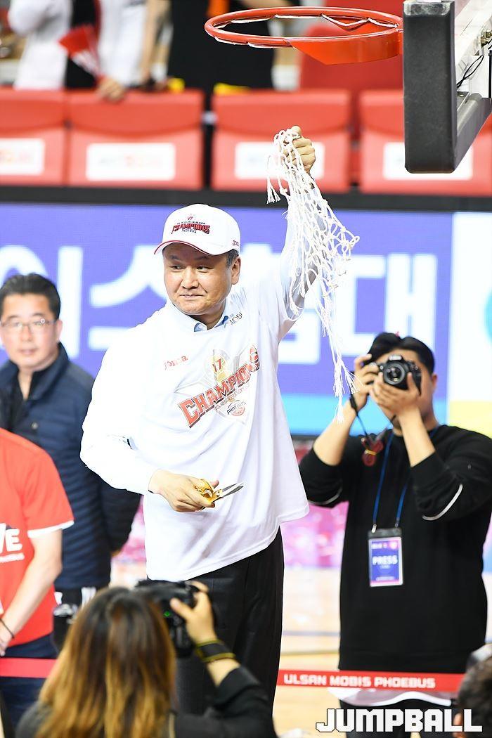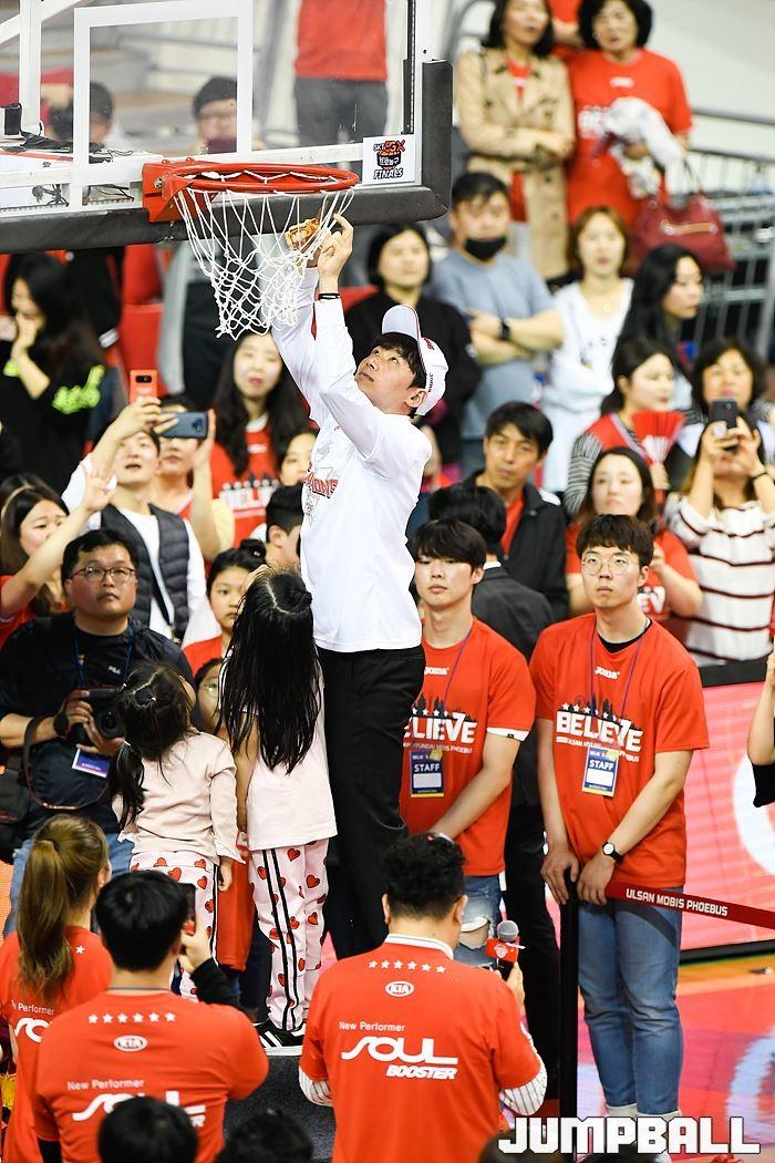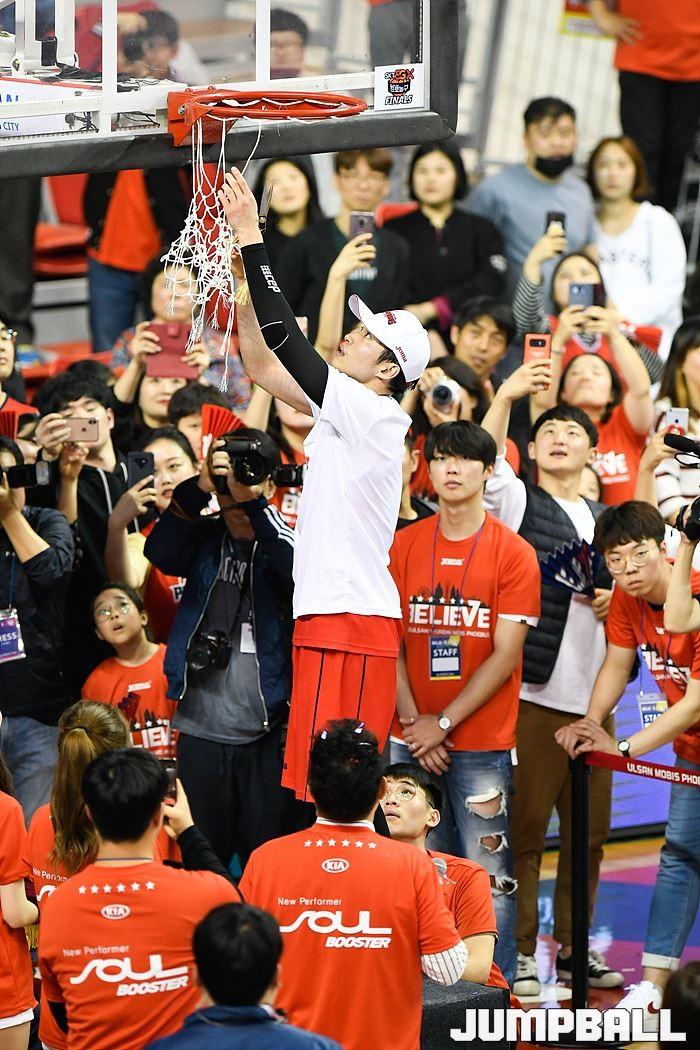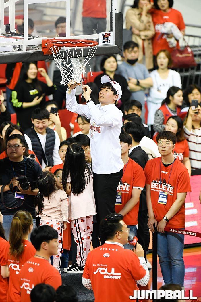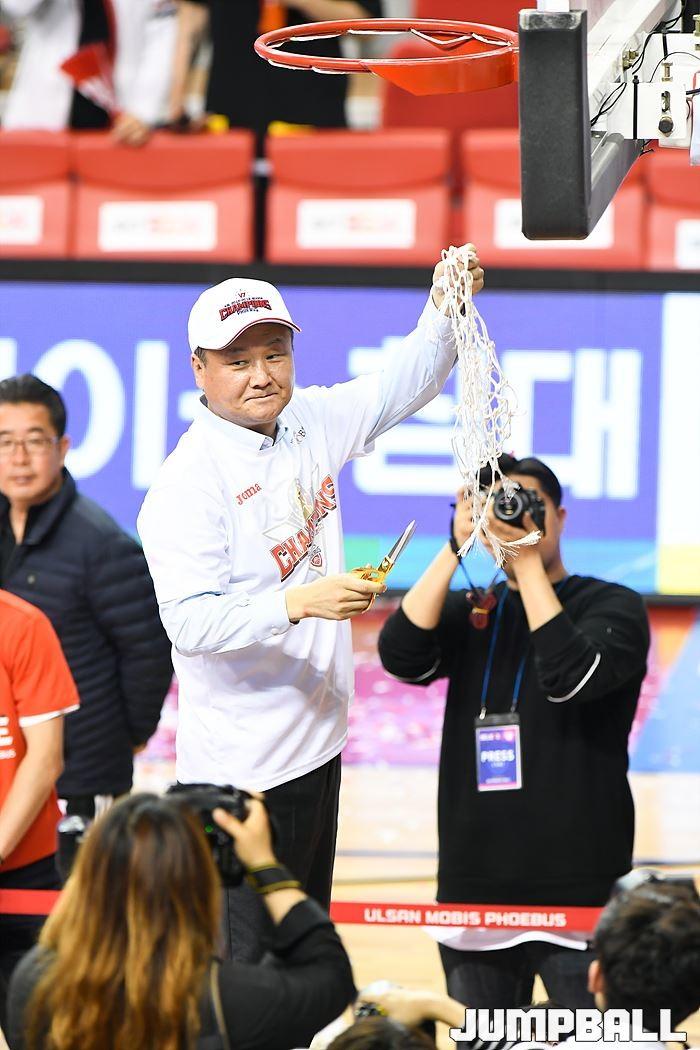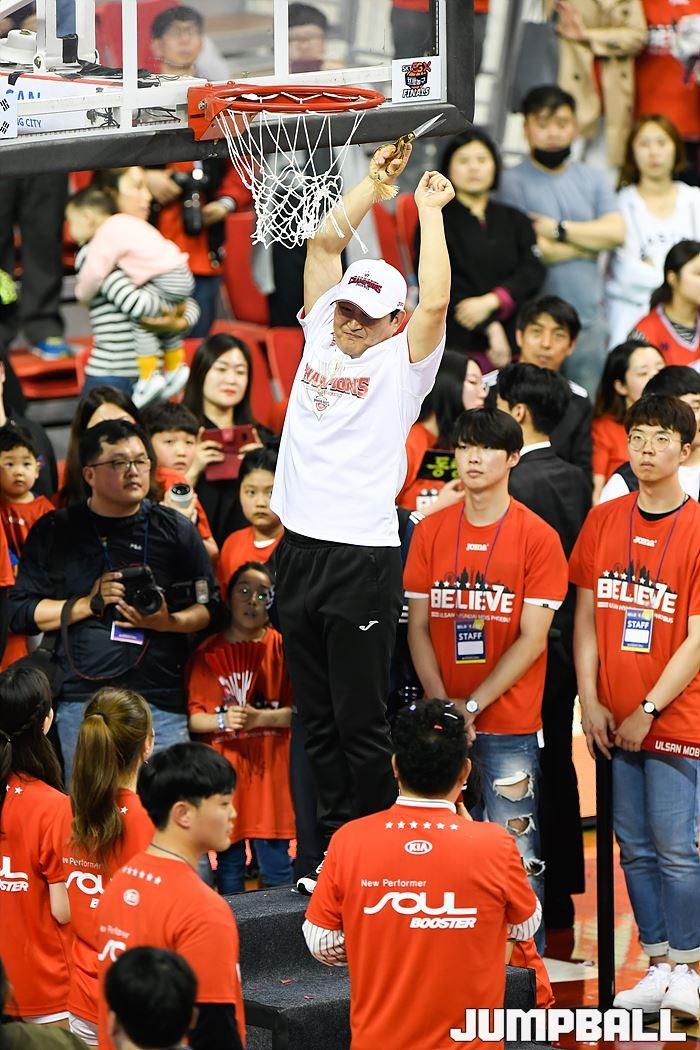 [점프볼=울산/홍기웅, 유용우 기자] 21일 울산동천체육관에서 열린 '2018-2019 SKT 5GX 프로농구' 챔피언결정전 5차전 울산 현대모비스와 인천 전자랜드의 경기에서 현대모비스가 92-84로 승리를 거둬 통합우승을 달성했다. 현대모비스 그물 컷팅식 화보.