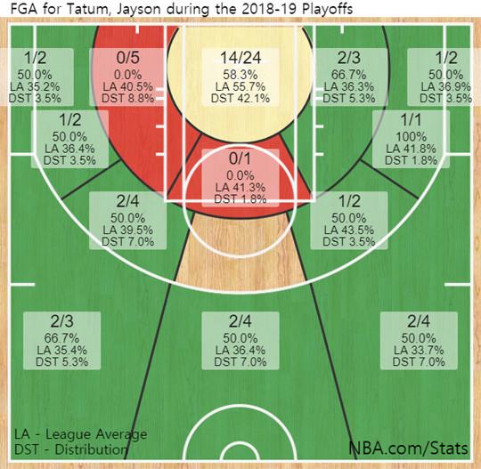 #2018-2019시즌 플레이오프 1라운드 제이슨 테이텀 야투성공률 분포도(*22일 기준)