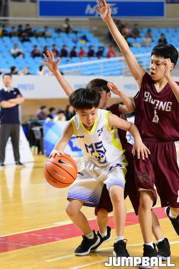 [점프볼=김천/박상혁 기자] 23일 김천실내체육관에서 열린 제 18회 대한민국농구협회장배 전국초등학교 농구대회, 매산초가 비봉초 두명의 수비에 막혀있다.