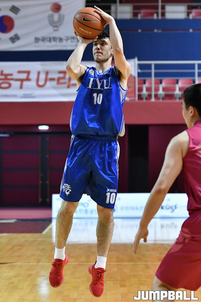 [점프볼=수원/홍기웅 기자] 24일 경희대학교 국제캠퍼스 선승관에서 열린 '2019 KUSF 대학농구 U-리그' 경희대와 한양대의 경기. 한양대 벌드수흐가 연속해서 3점슛을 던져 득점에 성공시키고 있다.
