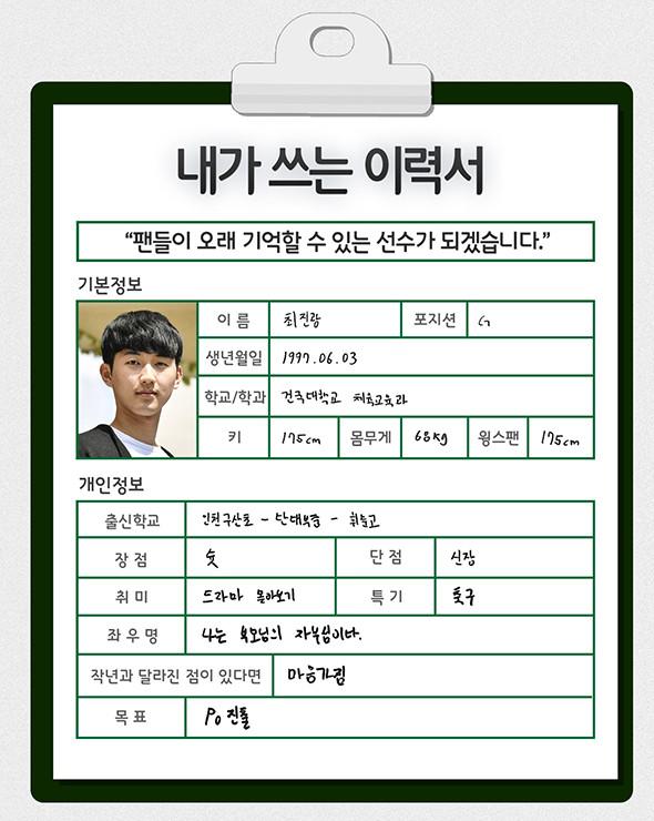 [점프볼=강현지 기자] 2019 KBL 국내신인선수 드래프트에 나오는 예비 프로들이 쓰는 취업이력서. 네 번째 주인공은 4년 내내 건국대의 앞선을 이끈 주장 최진광(22, 175cm)이다. 축구를 하던 어린 최진광이 유소년 농구를 거쳐 단대부중 농구부에 들어가기까지. 다양한 경기 출전 경험을 통해 능력치를 쌓은 그가 대학리그 최고 레벨인 이상백배 대학선발팀 최종 12인 명단에 승선한 가운데, 그의 목표와 더불어 프로 이야기를 들어봤다.