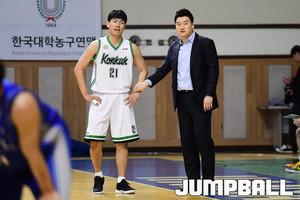 [점프볼=서울/박상혁 기자] 2일 한양대 올림픽 체육관에서 열린 '2019 KUSF 대학농구 U-리그' 한양대와 건국대의 경기. 한양대 김민진이 돌파를 시도하고 있다.
