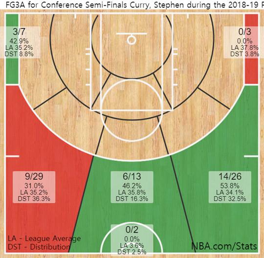 커리는 1라운드 6경기 평균 24.7득점(FG 50%) 6.7리바운드 5.2어시스트를 기록한 것과 달리 세미파이널에선 3경기 평균 38.2분 18.3득점(FG 35.3%) 4.3리바운드 4.3어시스트를 기록하는 데 그치고 있다. 장기인 3점 성공률도 25%(2.7개 성공)에 그치고 있다. 정규리그 평균 43.7%(5.1개 성공)의 3점 성공률을 기록하며 성공률 분포도에서 모든 지역이 초록색으로 물들었던 커리였지만 이번 세미파이널에선 아래 3점 성공률 분포도에 보이듯 커리 답지 못한 모습으로 외곽 슛의 부진이 길어지고 있다. 심지어 지난 3경기 와이드 오픈 상황에서도 총 12개의 3점을 시도해 단 4개만을 림에 꽂아 넣는 등 세미파이널 커리의 슈팅부진이 심상치가 않다.