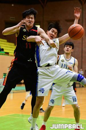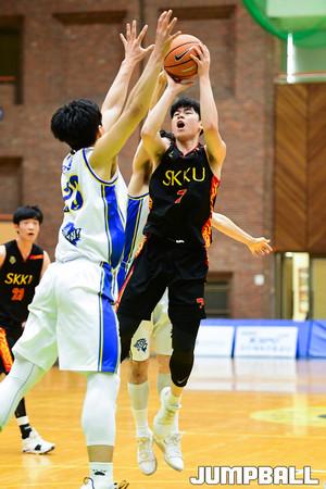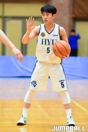 [점프볼=수원/박상혁 기자] 7일 수원 성균관대학교에서 열린 '2019 KUSF 대학농구 U-리그 성균관대와 한양대의 경기, 한양대 김민진이 빽슛을 시도하고 있다.