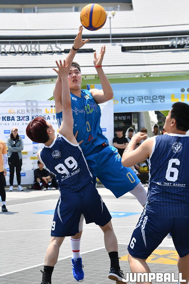 [점프볼=광주/홍기웅 기자] 11일 광주 금호터미널 유스퀘어광장 특설코트에서 열린 '2019 KBA 3X3 코리아 투어' 코리아리그 하늘내린인제와 ATB 경기. 하늘내린인제가 균형을 잃은 자세에서 골밑슛을 시도하고 있다.