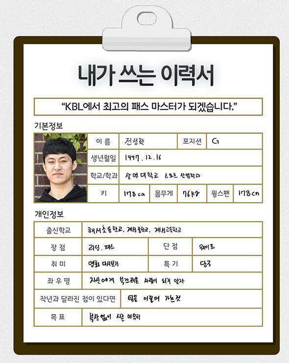 [점프볼=강현지 기자] 2019 KBL 국내신인선수 드래프트에 나오는 예비 프로들이 쓰는 취업이력서. 여섯 번째 주인공은 2대2에 능한 포인트가드, 상명대 전성환(22, 178cm)이다. 꾸준함 하나로 아마무대에서 존재감을 알린 가운데 그는 KBL 최고의 패스 마스터가 되고 싶다며 프로를 향한 당찬 각오를 전했다. 많은 출전시간 만큼이나 책임감도 강해졌다. 자신에게 부끄러운 사람이 되지 말자는 좌우명 하나로 전성환은 코트 안팎의 캡틴 역할을 충실히 해내고 있다.