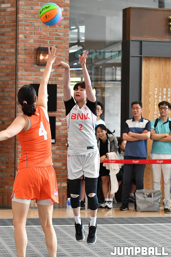 [점프볼=하남/홍기웅 기자] 25일 하남스타필드 특설코트에서 열린 'WKBL 3X3 트리플잼' BNK와 켈미의 경기. BNK 이소희가 3연속으로 2점슛을 적중시키고 있다.