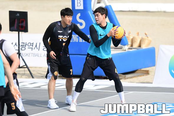 [점프볼=부산/박상혁 기자] 25일 부산 광안리 해수욕장 특설코트에서 열린 2019 KXO리그 2라운드 겸 KXO 3x3 부산투어 1일차 경기, DSB 박래훈과 안산TOP 전정규가 일대일을 하고 있다.