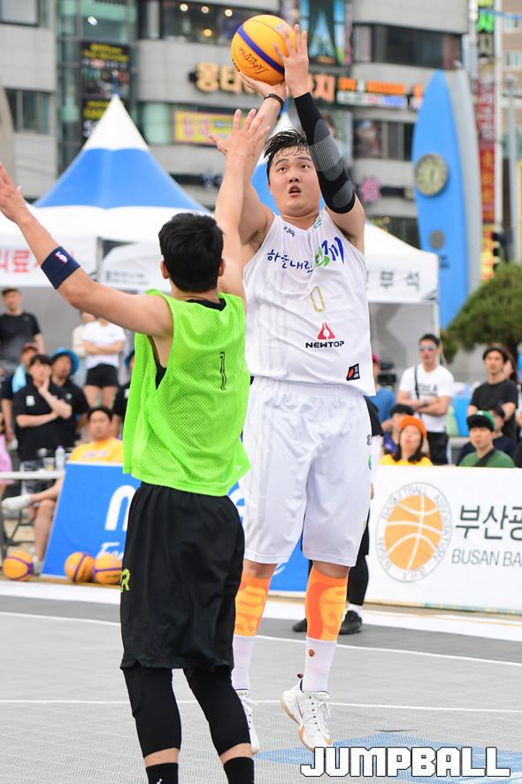 [점프볼=부산/박상혁 기자] 26일 부산 광안리 해수욕장 특설코트에서 열린 2019 KXO리그 2라운드 겸 KXO 3x3 부산투어 2일차 경기, 하늘내린인제 하도현이 점프슛을 시도하고 있다.