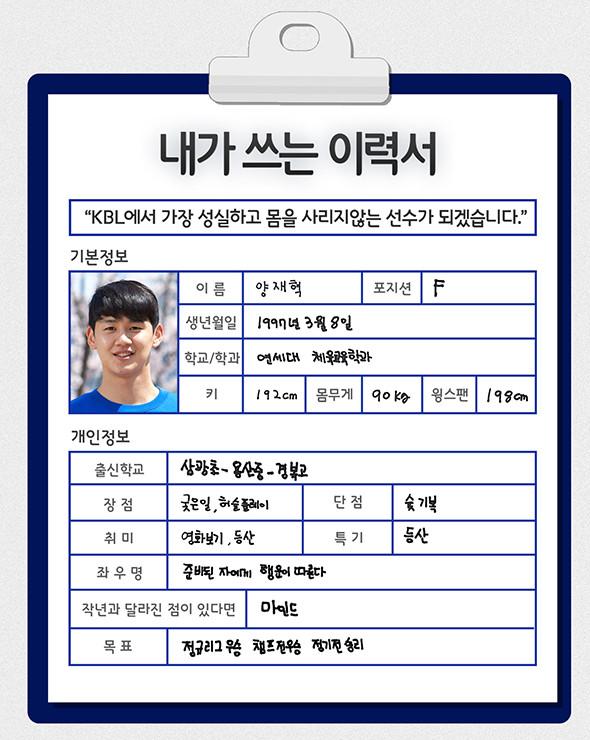 [점프볼=강현지 기자] 2019 KBL 국내신인선수 드래프트에 나오는 예비 프로들이 쓰는 취업이력서. 일곱 번째 주인공은 차세대 양희종을 꿈꾸는 연세대 양재혁(22, 192cm)이다. 부모님의 영향으로 농구공을 잡은 그가 양희종의 플레이에 매료돼 ‘프로 선수’가 되기로 결심했다. 승리만을 위해 궂은일을 마다치 않는 모습에 양희종의 에너지 넘치는 모습이 그려지기도 하는 그를 만나 대학리그, 또 프로 무대에 대한 이야기를 나눠봤다.