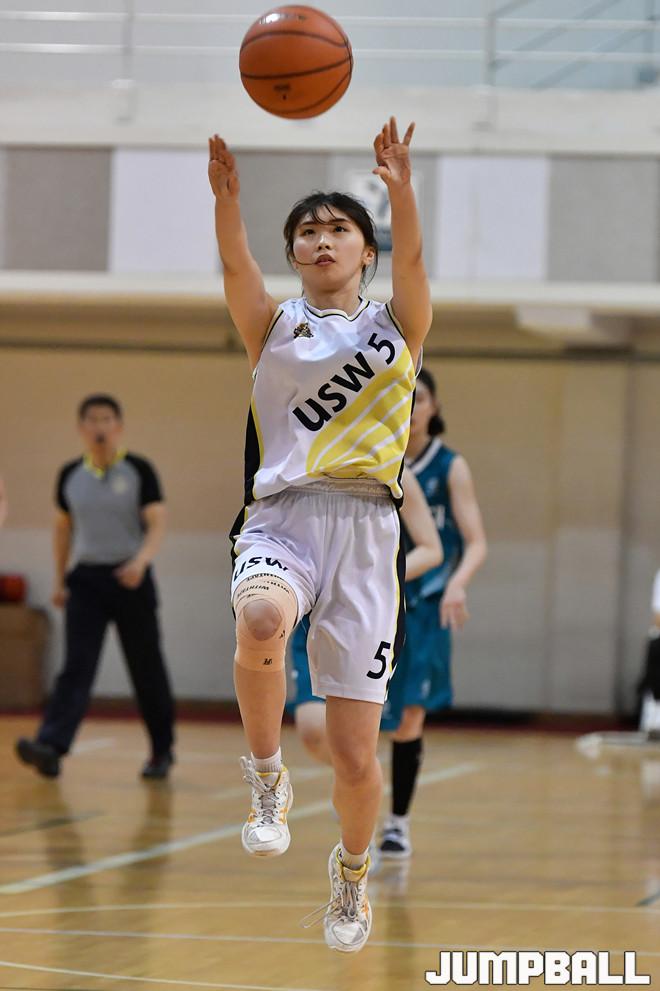 [점프볼=용인/홍기웅 기자] 31일 용인대학교 체육관에서 열린 '2019 KUSF 대학농구 U-리그' 용인대와 수원대의 경기. 수원대 김지원이 경기 종료 직전 버저비터를 득점시키고 있다.