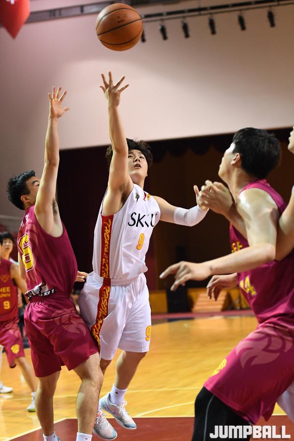 [점프볼=수원/문복주 기자] 3일 수원 경희대학교 국제캠퍼스 선승관에서 열린 '2019 KUSF 대학농구 U-리그' 경희대와 성균관대의 경기, 성균관대 임기웅이 골밑에서 수비를 제치고 슛을 시도하고 있다.