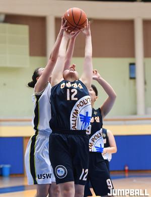 [점프볼=춘천/문복주 기자] 12일 춘천 한림성심대학교체육관에서 열린 '2019 KUSF 대학농구 U-리그' 한림성심대와 수원대의 경기.수원대 배예림이 골밑에서 두명의 수비를 뚫고 슛을 시도하고 있다.