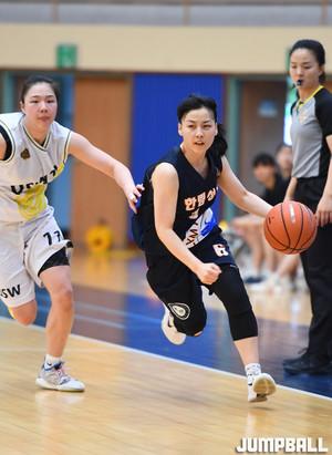[점프볼=춘천/문복주 기자] 12일 춘천 한림성심대학교체육관에서 열린 '2019 KUSF 대학농구 U-리그' 한림성심대와 수원대의 경기. 한림성심대 김민정이 순간 골밑 돌파로 레이업을 시도하고 있다.