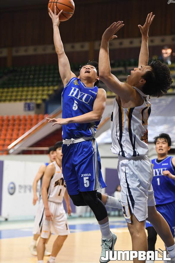 [점프볼=서울/박상혁 기자] 12일 한양대학교 올림픽 체육관에서 열린 2019 KUSF 대학농구 U-리그 한양대와 상명대의 경기, 한양대 김민진이 수비를 달고 슛을 시도하고 있다.