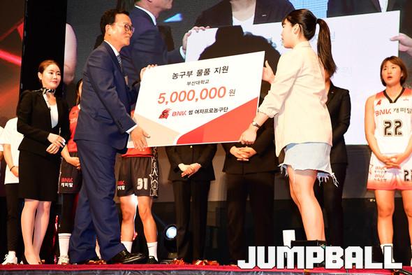 [점프볼=부산/박상혁 기자] 24일 부산롯데호텔 3층 크리스탈볼룸에서 'BNK 썸 여자프로농구단' 공식 창단식이 열렸다. 이두호 BNK캐피탈 대표가 부산대학교와 물품 지원식을 하고 있다.