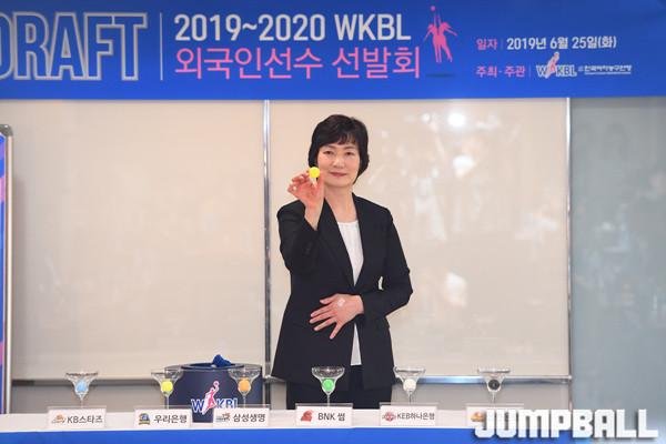[점프볼=서울/문복주 기자] 25일 서울시 강서구 WKBL 사옥 2층에서 2019-2020 WKBL 외국인선수 선발회에 박찬숙 WKBL 경기운영본부장이 2그룹 전체 4순위로 노란색 볼 우리은행을 추첨하고 있다.