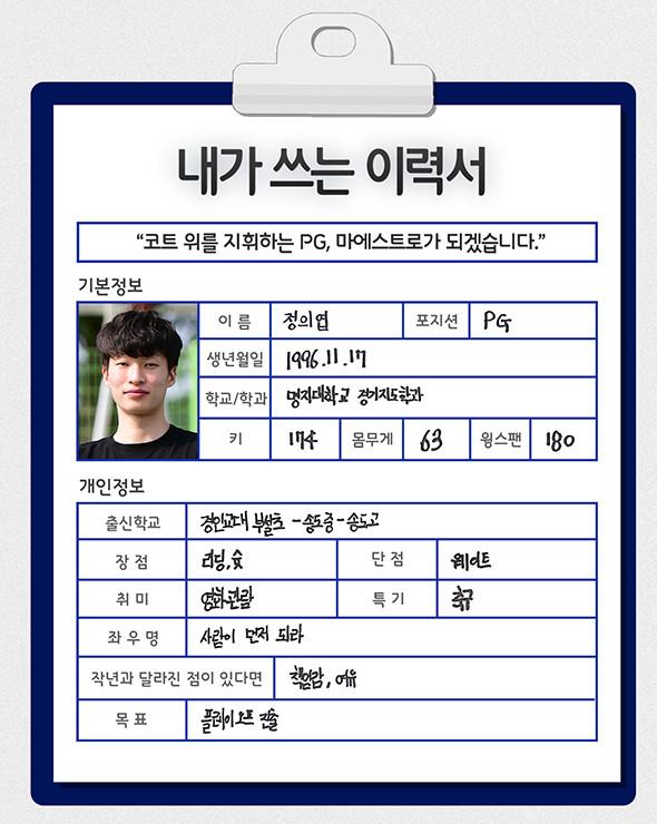 [점프볼=강현지 기자] 2019 KBL 국내신인선수 드래프트에 나오는 예비 프로들이 쓰는 취업이력서. 열한 번째 주인공은 명지대 정의엽(G, 174cm)이다. 가드의 산실로 불리는 송도중·고 출신인 그는 속공 상황에서의 장점, 안정적인 리딩 능력으로 명지대를 이끌고 있다. 슛 강점까지 갖춘 그의 목표는 ‘정의엽’ 이름 알리기. 대학리그 전반기 아쉬움을 삼키고 도약을 위해 후반기를 바라보고 있는 그를 만나 앞으로의 각오를 들어봤다.