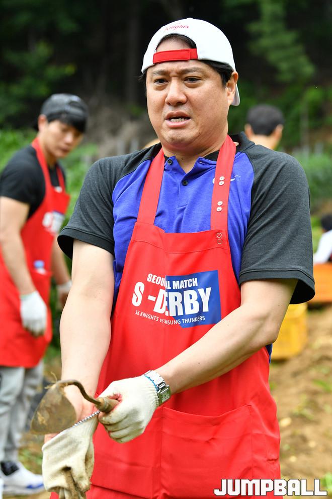 [점프볼=용인/홍기웅 기자] 29일 용인 양지바른 장애인 복지시설에서 열린 S더비(SK, 삼성) 팬과 함께하는 일일 봉사활동. SK 문경은 감독이 감자 캐기 봉사활동을 진행하기 위해 장갑을 점검하고 있다.