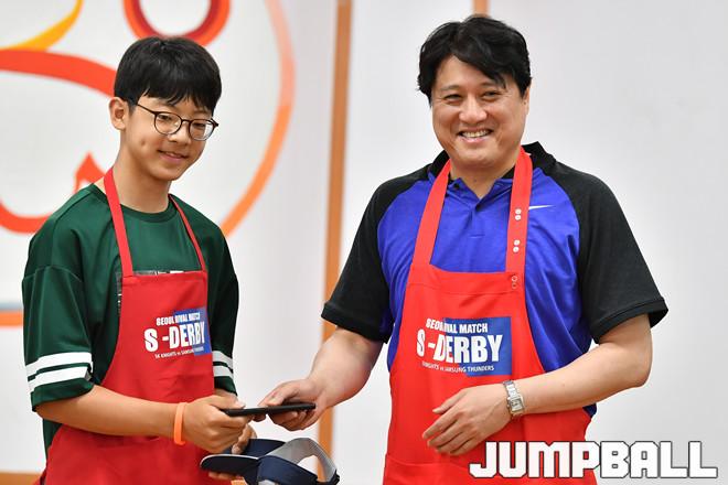 [점프볼=용인/홍기웅 기자] 29일 용인 양지바른 장애인 복지시설에서 열린 S더비(SK, 삼성) 팬과 함께하는 일일 봉사활동. SK 문경은 감독이 봉사활동에 참여한 중1 학생팬에게 최신 폰을 선물하고 있다.