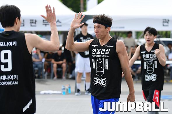 [점프볼=홍천/박상혁 기자] 30일 홍천 비발디 파크에서 열린 2019 KXO 3라운드 겸 홍천투어 2일차 경기, 리그 결승에서 한울건설 방성윤과 김상훈이 하이파이브를 하고 있다.