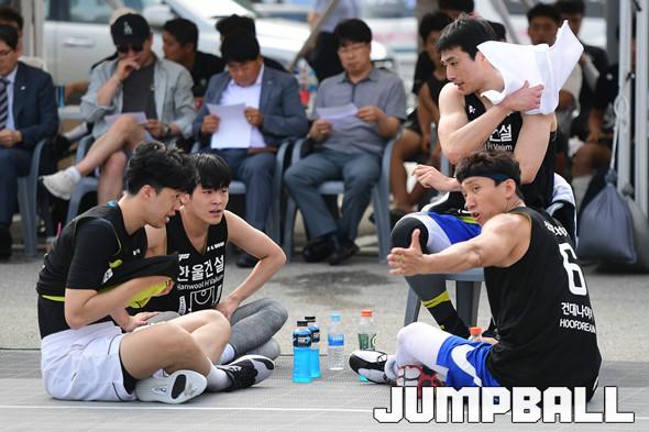 [점프볼=홍천/박상혁 기자] 30일 홍천 비발디 파크에서 열린 2019 KXO 3라운드 겸 홍천투어 2일차 경기, 한울건설이 작전시간을 이용해 작전을 논의하고 있다.