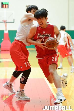 [점프볼=용인/박상혁 기자] 2일 용인시 양지 SK나이츠 연습체육관에서 열린 SK와 고려대의 연습경기, SK 장태빈이 공을 받아줄 선수를 찾고 있다.