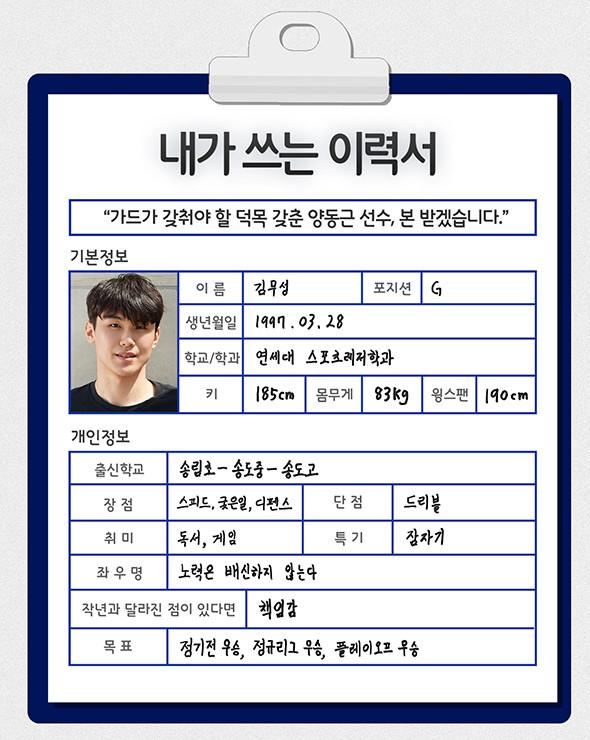 프로무대 진출을 앞두고 슛 성공률 높이기에 주안을 두고 있다는 김무성. 프로 형들과 부딪히면서 웨이트가 부족하다는 걸 느껴 이에 대한 보강 운동에도 한창이다. “양동근 선수같이 꾸준하게 잘하는 선수가 되고 싶은데, 연습 경기를 하면 힘도 세고 노련하시다는 걸 느껴요. 또 수비도 잘하시고, 가드로서 갖춰야 할 것들을 다 가지고 계시잖아요”라고 롤모델을 이야기 한 그는 “감독님도 제게 강조해 주는 부분도 웨이트인데, 계속 하는데도 안 느는 게 웨이트 같아요. 그래도 (웨이트를)꾸준히 하려고요”라고 힘줘 말했다.