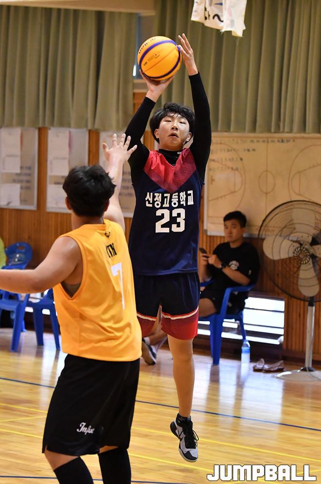 [점프볼=부산/홍기웅 기자] 13일 부산중앙고등학교 체육관에서 열린 'KB국민은행 리브 2019 KBA 3X3 코리아 투어 부산' U18 신정고등학교와 인피니트스포츠의 경기. 신정고등학교가 점프슛을 던지고 있다.