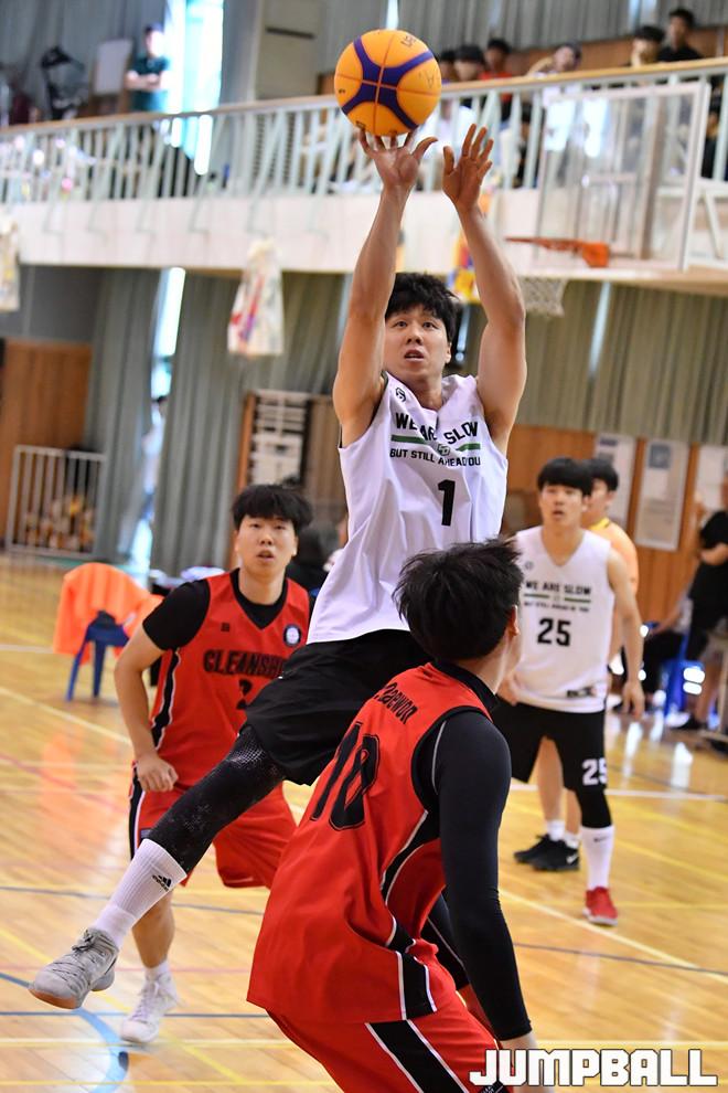 [점프볼=부산/홍기웅 기자] 13일 부산중앙고등학교 체육관에서 열린 'KB국민은행 리브 2019 KBA 3X3 코리아 투어 부산' 오픈부 클린샷과 슬로우피벗의 경기. 슬로우피벗이 다리를 벌리며 점프슛을 성공시키고 있다.