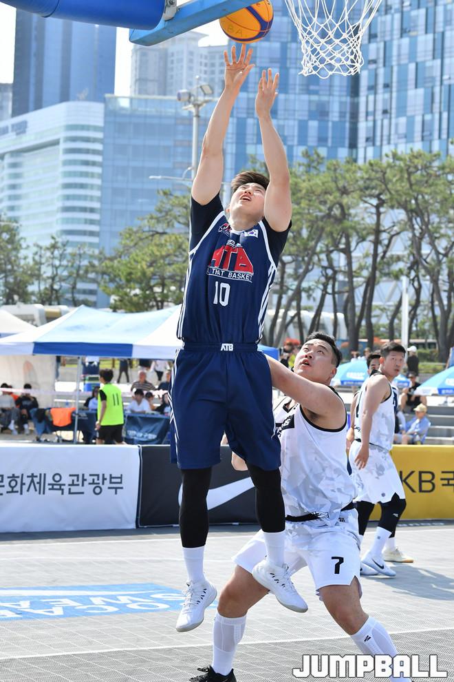 [점프볼=부산/홍기웅 기자] 14일 해운대 해수욕장 특설코트에서 열린 'KB국민은행 리브 2019 KBA 3X3 코리아 투어 부산' 리그 6강 ATB와 에너스킨의 경기. ATB가 골밑슛을 던지고 있다.