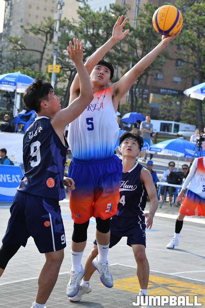 [점프볼=부산/홍기웅 기자] 14일 해운대 해수욕장 특설코트에서 열린 'KB국민은행 리브 2019 KBA 3X3 코리아 투어 부산' U18 국가대표 선발 결승 팀코리아 2.5와 NO Name의 경기. 팀코리아 2.5가 레이업을 시도하고 있다.